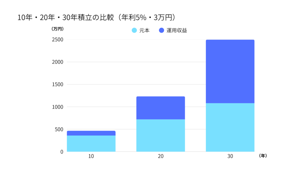 特に注目したいのは、30年後には利益が元本を大きく上回っている点です。元本は2倍、3倍ですが、運用収益は約5倍、約13倍と、後半になるほど増え方が加速していきます。これは、複利が後半に強く効いてくるからです。