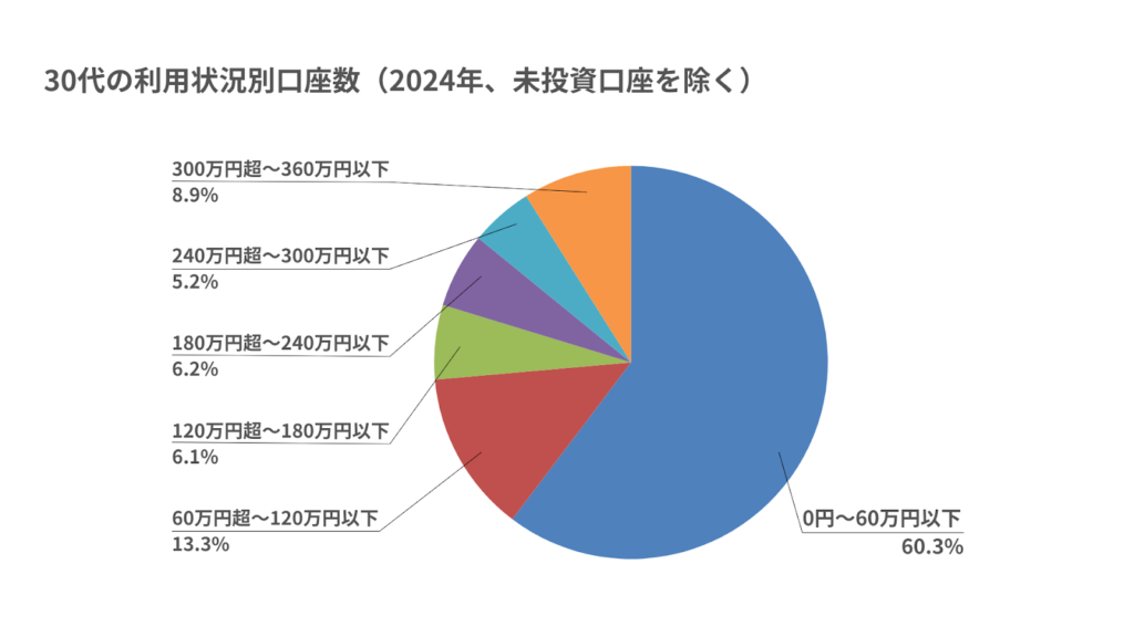金融庁の統計では、30代の買付あり口座のうち年間180万円超の高額投資層が約2割を占めています。最も多い割合の約6割の口座は、年60万円以下(月5万円以下)というのが実情です。